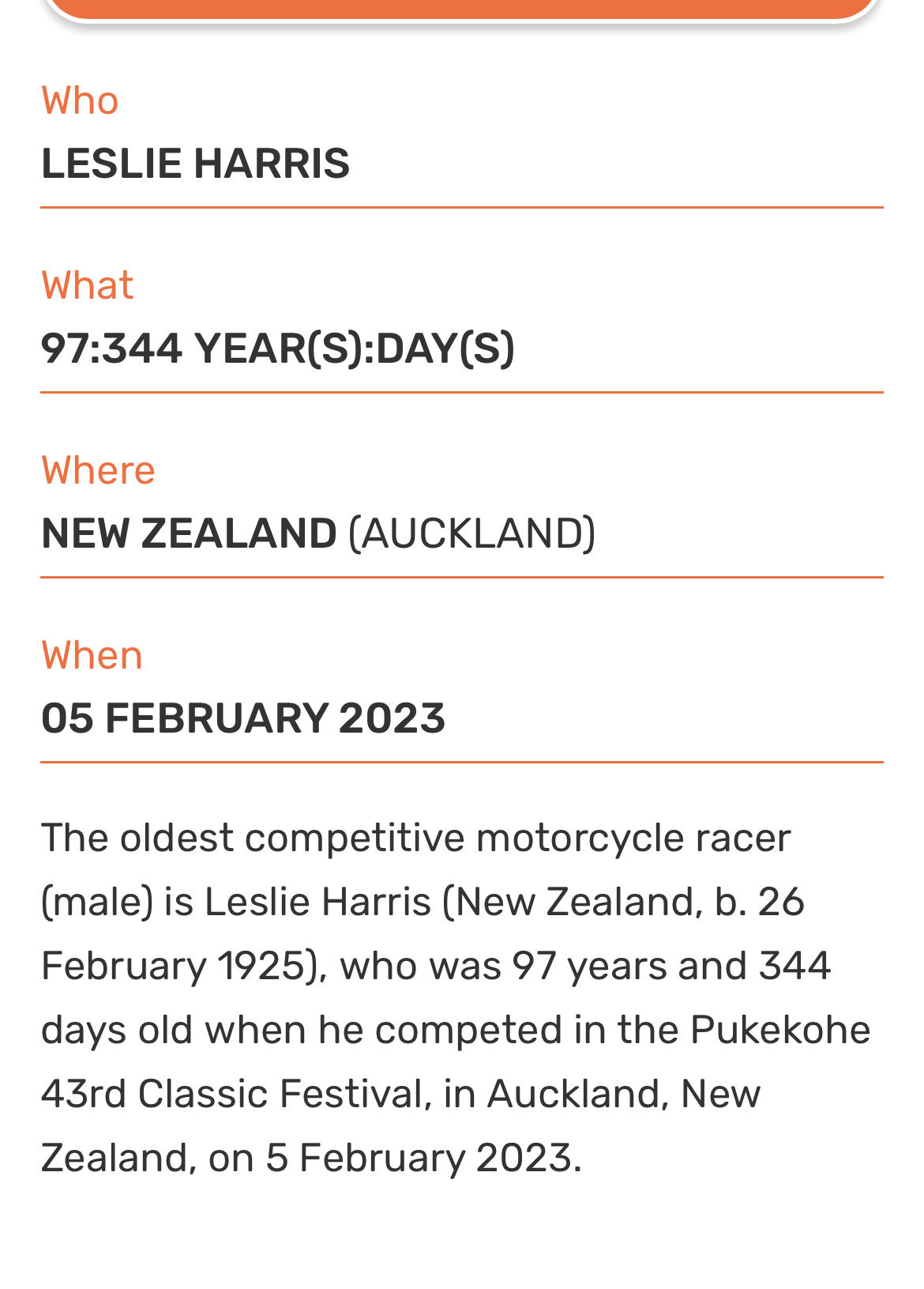 Hi team we are stoked to announce as of Sept 13 2023 the record has been released publicly! https://www.guinnessworldrecords.com/news/2023/9/97-year-old-grandad-sets-record-as-worlds-oldest-motorcycle-racer-758426#:~:text=Leslie%20Harris%20(New%20Zealand)%20is,but%20he's%20not%20dying%20young.&text=Earlier%20this%20year%2C%20at%20the,world's%20oldest%20competitive%20motorcycle%20racer.