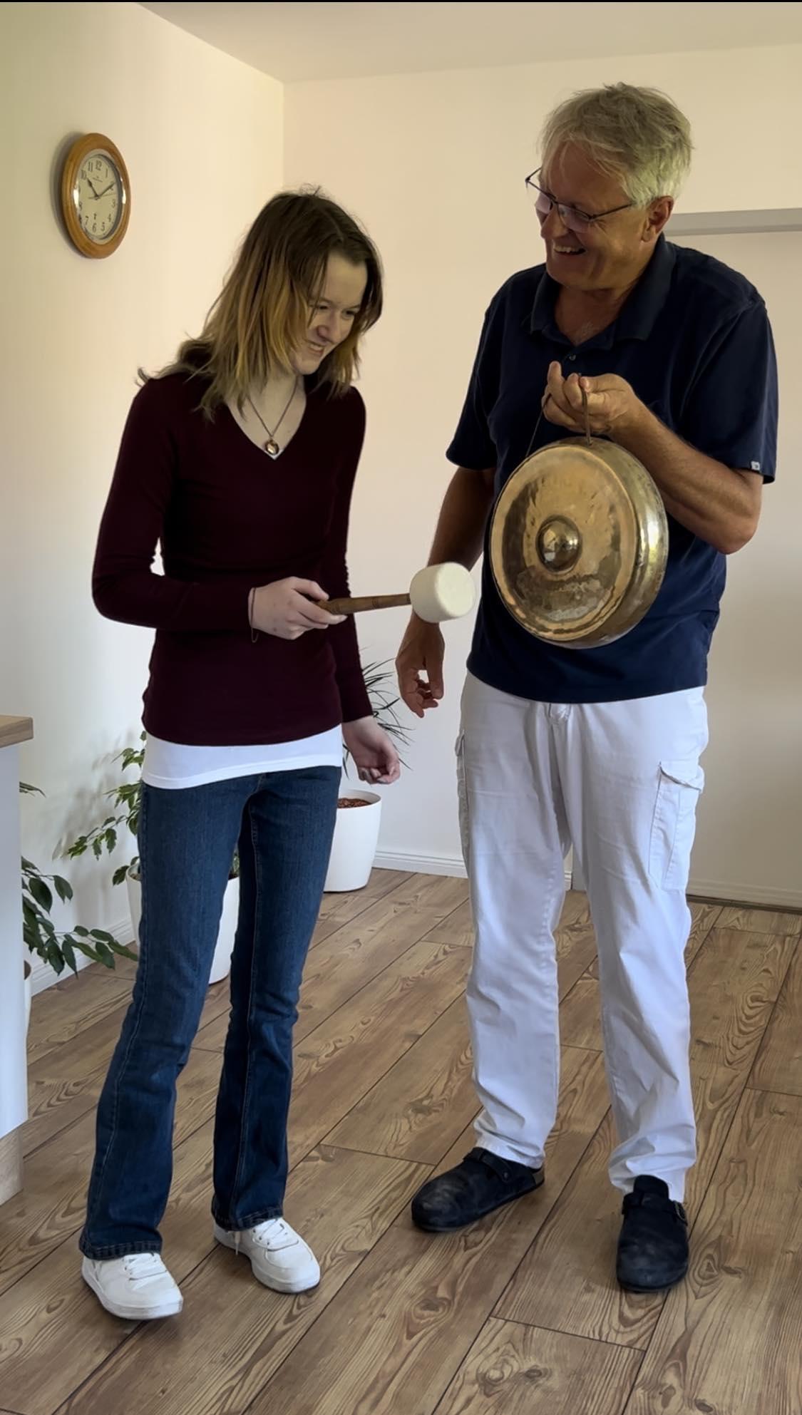 The photo is with Professor Scholmann with the gong of hope.