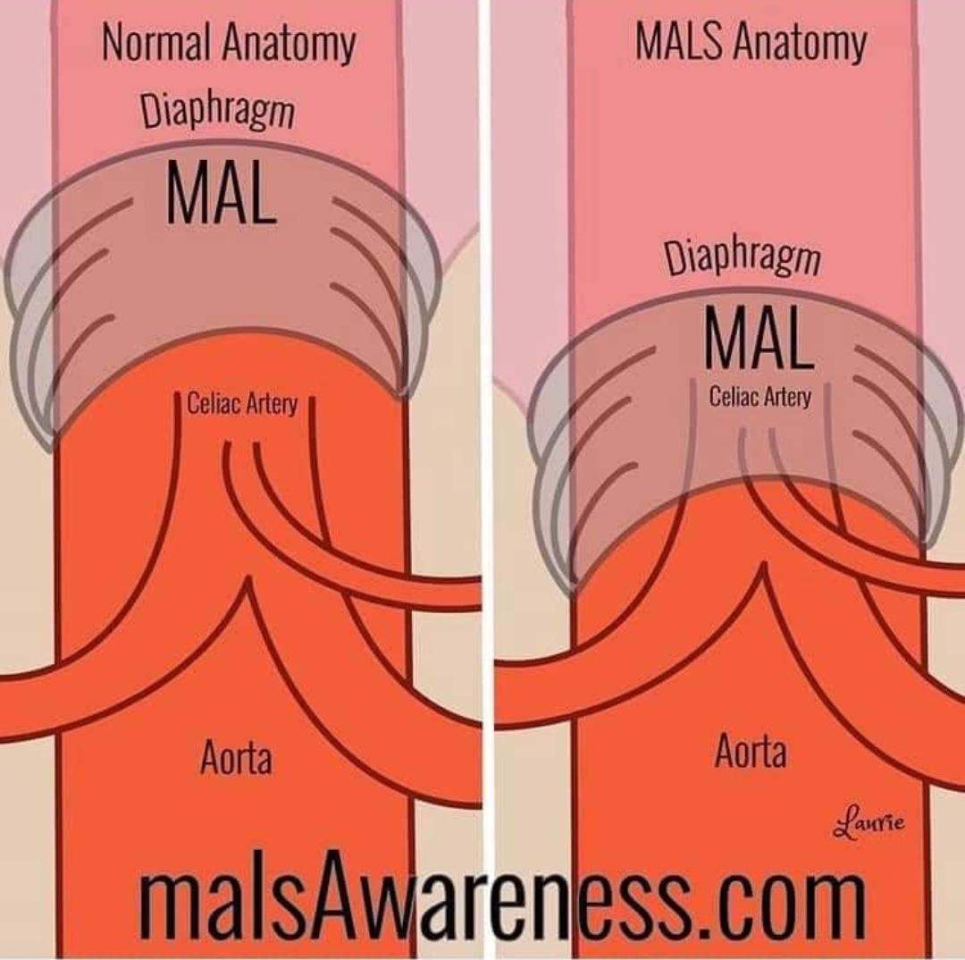 💙 2. Median arcuate ligament syndrome (MALS). This is when the celiac trunk and the celiac plexus nerves are compressed by the median arcuate ligament. The celiac trunk is a major artery that supplies blood to the stomach, spleen, liver, gallbladder, and pancreas. It is the first branch of the abdominal aorta located near the diaphragm.