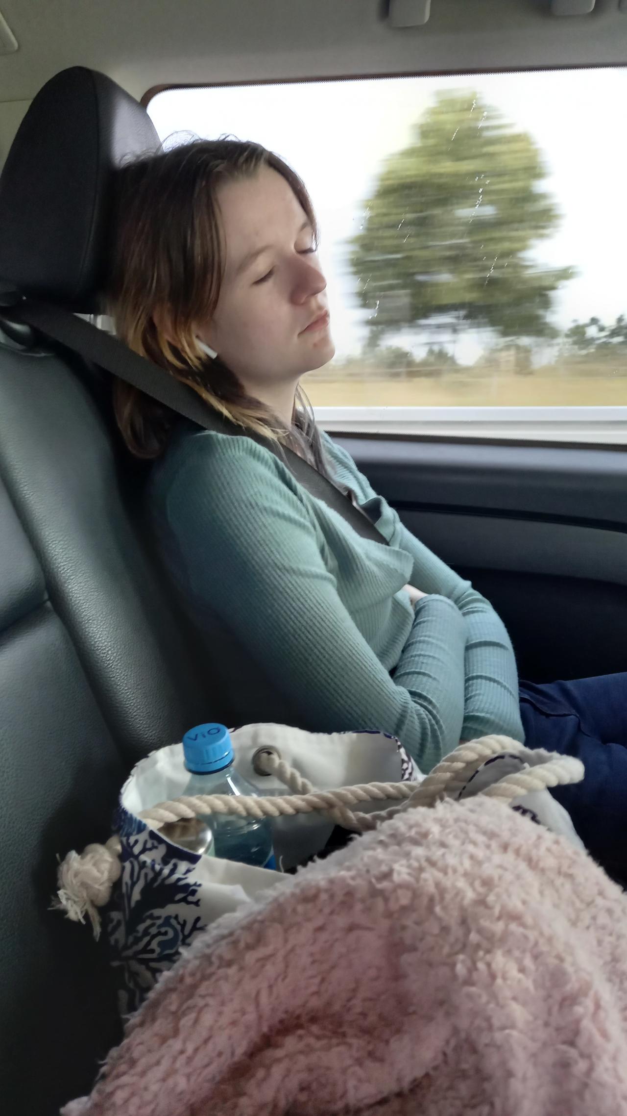 We are finally on our way. Jaimee slept on the flight from Napier to Auckland. Our flight leaves Auckland in 4 hours.