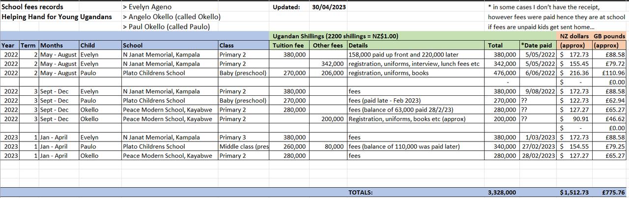 The total cost of their tuition plus registration, uniforms, exercise books etc since March last year was approx NZ$1512 (3.3 million shillings) - see the payments summary table I have posted up. The next fees will be for term 2 (May - August), due this month. It works out to about $600 - $700 / term altogether for the 3 of them. They are all learning well at school and really happy to be there, although they are a couple of years behind their expected class for their age.