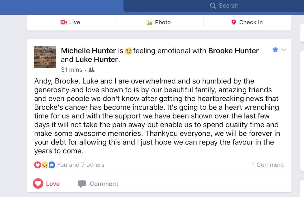 6 December 2017Sorry for not updating sooner! Brooke and her family have been very busy making some special memories, with so much thanks to all you amazing generous people. They made it to Oz and did the theme parks, Draculas and wildlife sanctuary where Brooke got to hold a koala which was a dream of hers, the family have had some beautiful family photos done. They got to rent a Bach at the beach for a couple of weekends and Brooke celebrated a birthday at the beach with extended family with a ride on on Harley motorcycles so many experiences have been happening and thank you and love to you all