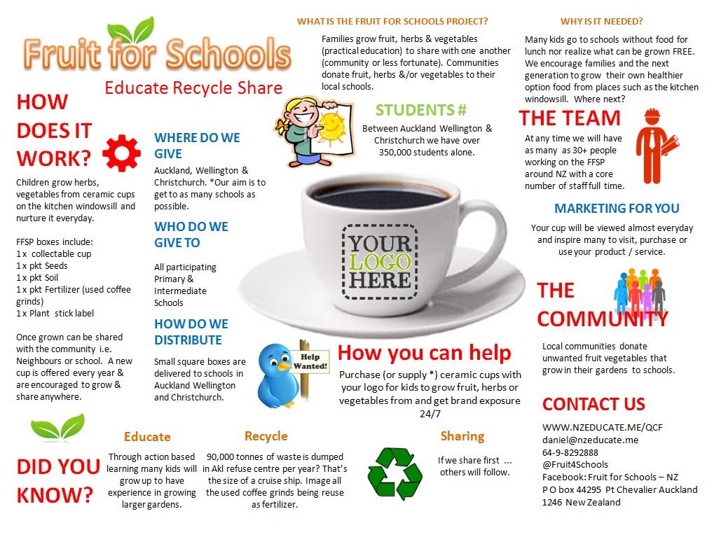 The Group FFS Reuse Used coffee grinds as fertilizer to keep plants moist, approximately 90,000 tonnes of garden waste is dumped in the Auckland waste centres which could be used to grown fruit for kids.