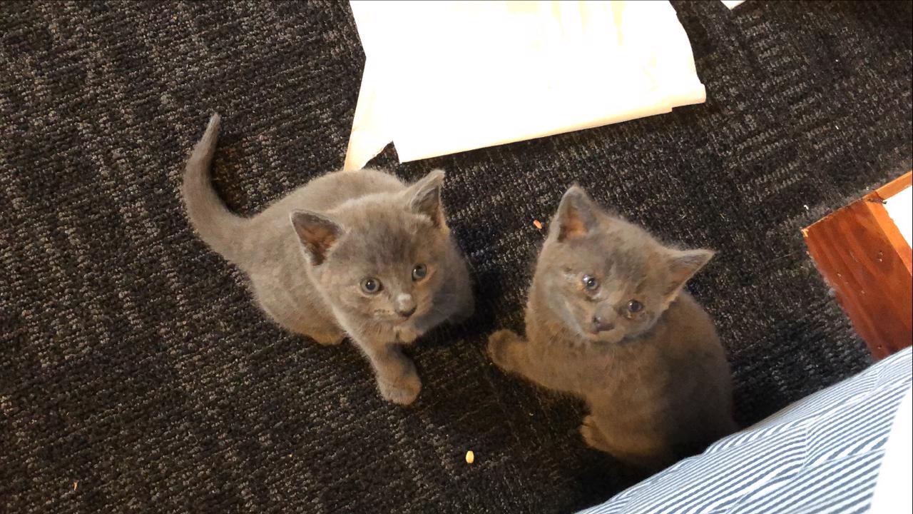 * 2/3 ~6 month old kittens ( 1 x black, 1 grey, genders unknown) most likely parents are Mr BZ and Storm based on colouring and behaviour