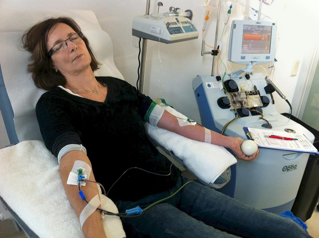 Day two was leukapheresis day, where blood is drawn out of one arm, centrifuged to separate the white cells and the red cells re infused into the other arm.The process takes about 3 hours during which they circulate about 6 litres of her blood through the centrifuge and extract approximately 250 cc of white cells. From this point it takes 7 days for the laboratory to separate the stem cells and grow them into Dendritic Cells which are tagged with Elaine’s cancer peptides to create the vaccine.
