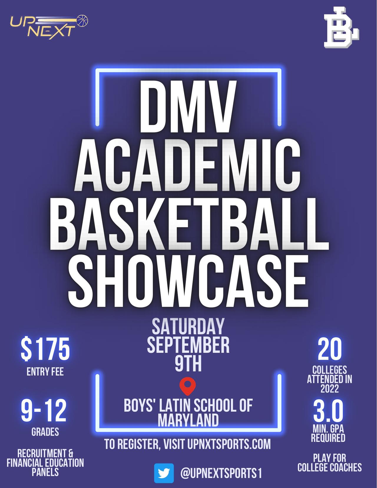 Boys Grades 9-12 DMV Academic Showcase at Boys’ Latin School in Baltimore … college coaches, recruiting services, and recruiting Q&A panels with upnxtsports.com