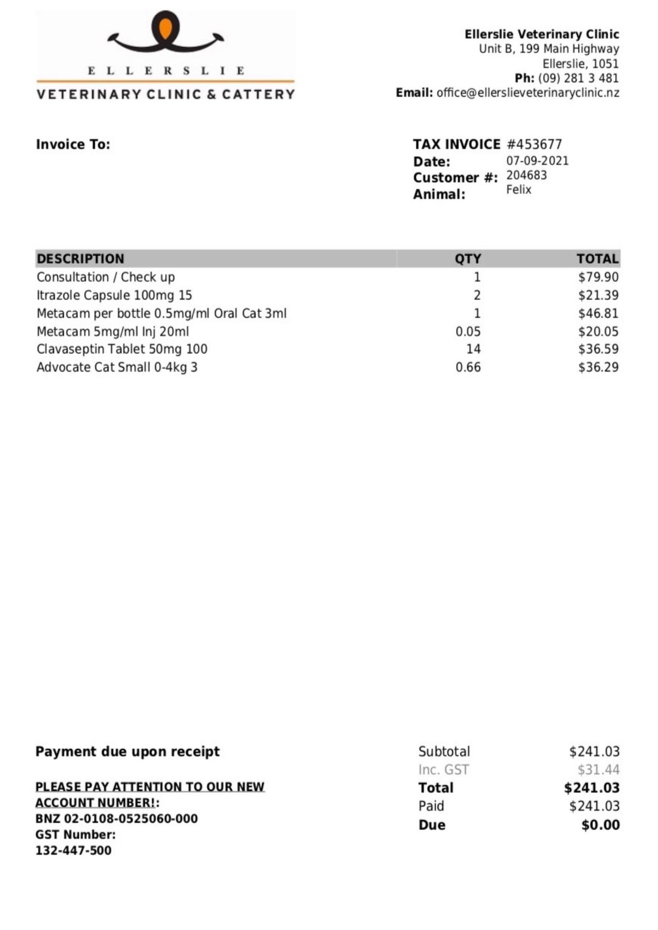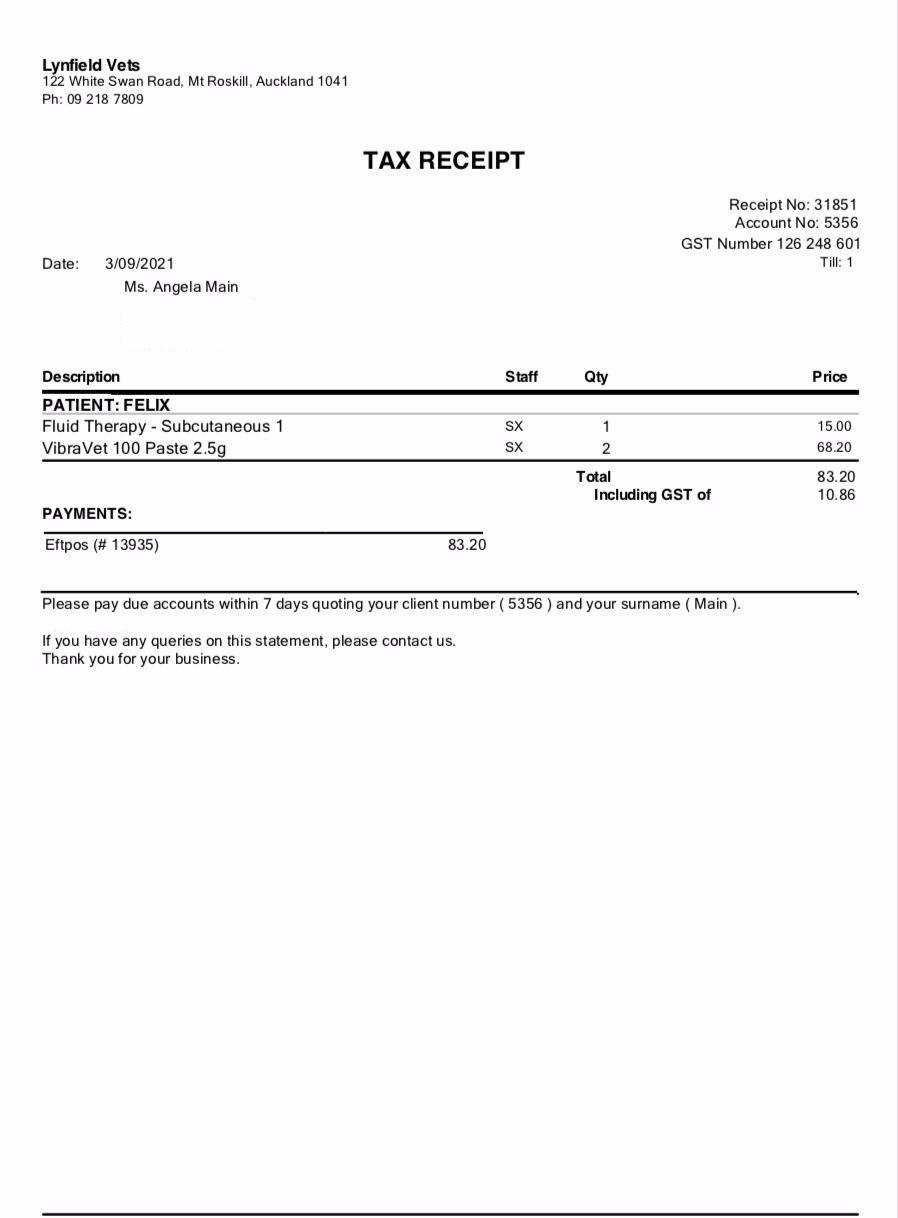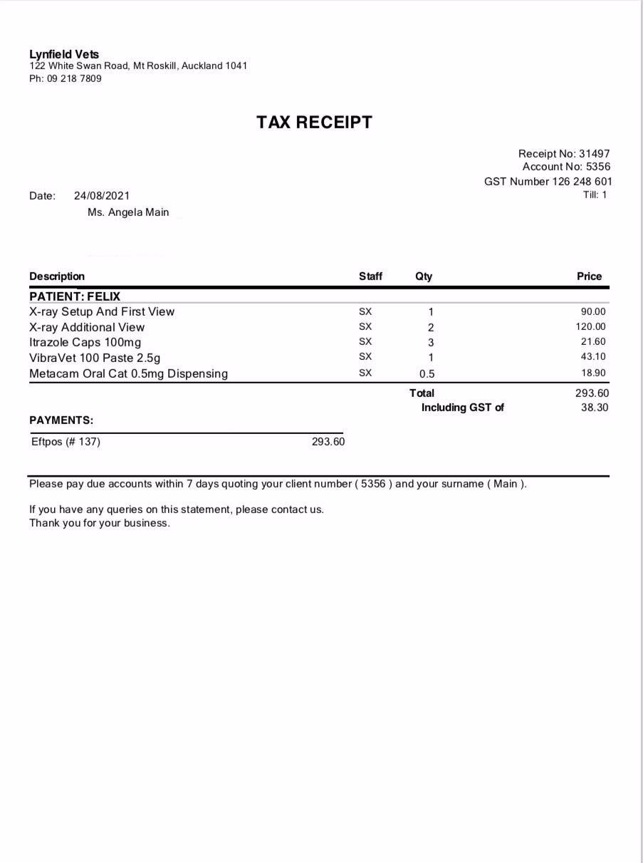 25 September 2021Felix has been eating well and seems to be slowly having more energy every day. He is going back to the vet for some more x-rays to see if his lungs have improved with all the medication he is having, so a plan can be made from there.