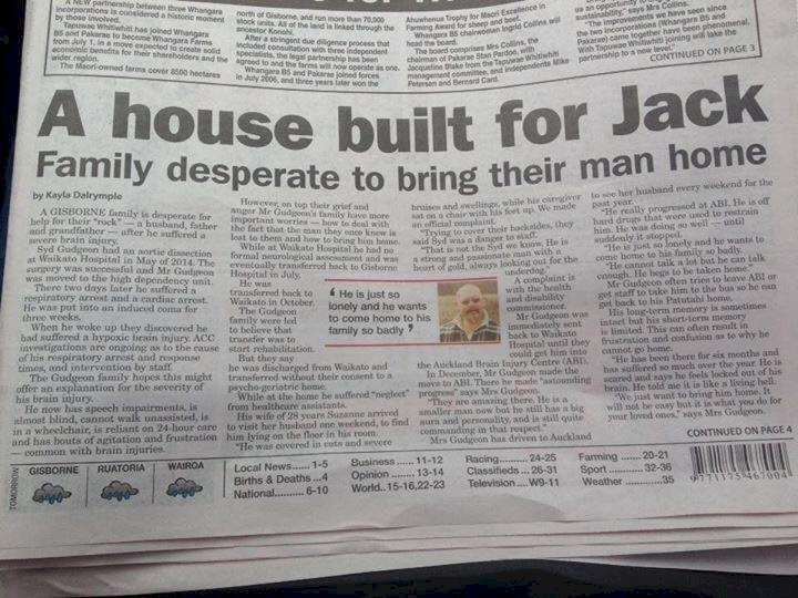 (Gisborne Hospital staff have been working with the family to find the best place for Mr Gudgeon and his family to continue rehabilitation and the best place for healthcare workers to provide 24-hour care — see separate story).