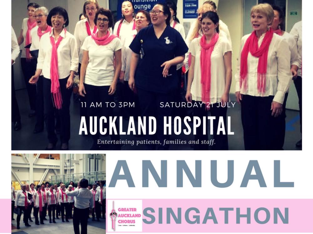 The Greater Auckland Chorus (GAC) is entertaining Auckland Hospital patients, visitors and staff with an extended performance - a continuous ‘Singathon’ - where we will sing from 11am to 3pm on Saturday 21st July in various locations throughout the hospital.