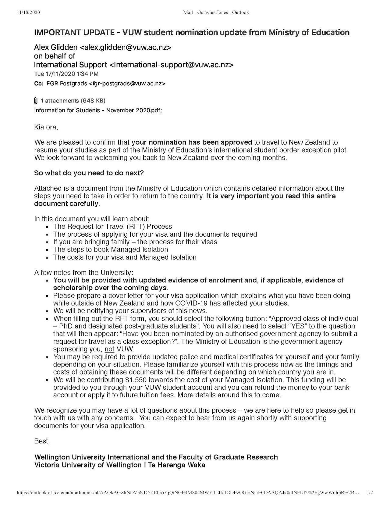 I am happy to announce that I have been accepted to apply for a visa exemption to return to New Zealand. The Ministry of Education has agreed to sponsor me as one of the 250 International students allowed back into NZ. I have completed the Request for Travel and have now moved on to the Invitation to Apply application. Once that is accepted I will be able to apply for Managed Isolation and Quarantine.
