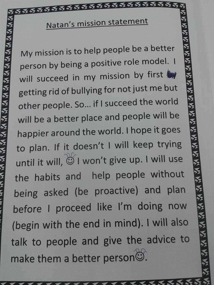 "My mission is to help people be a better person by being a positive role model. I will succeed in my mission by first getting rid of bullying for not just me, but for other people. So, if I succeed the world will be a better place and people will be happier around the world.I hope it goes to plan, if it doesn't i will keep trying until it will. I won't give up. I will use the habits, and help people without being asked (be proactive) and plan before i proceed like i'm doing now (begin with the end in mind). I will also talk to people and give the advice to make them a better person."