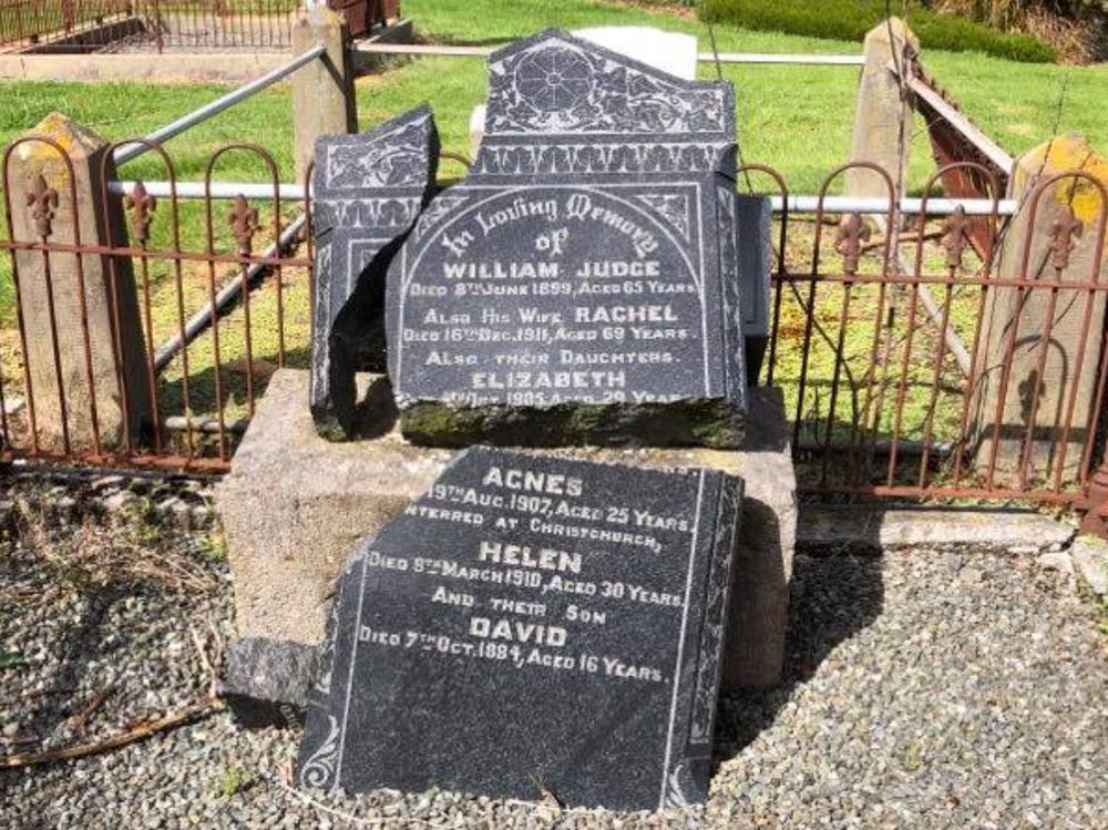 Whilst recently travelling in our beautiful country, I've had the pleasure of spending some time in the Invercargill area and have visited the burial site of my Great Great Grandparents, William and Rachel Judge who passed away in June 1899 and December 1911. Unfortunately the Headstone is in disrepair so I decided to ask a local stone mason for his thoughts on what we could possibly do to get it restored.