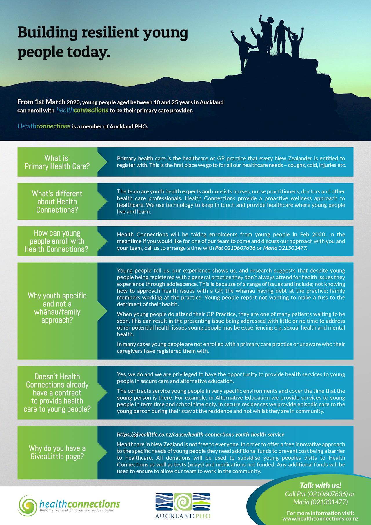 As a member of Auckland PHO, Health Connections will be providing a proactive wellness approach to healthcare for our youth where they live and learn. Find out more below!