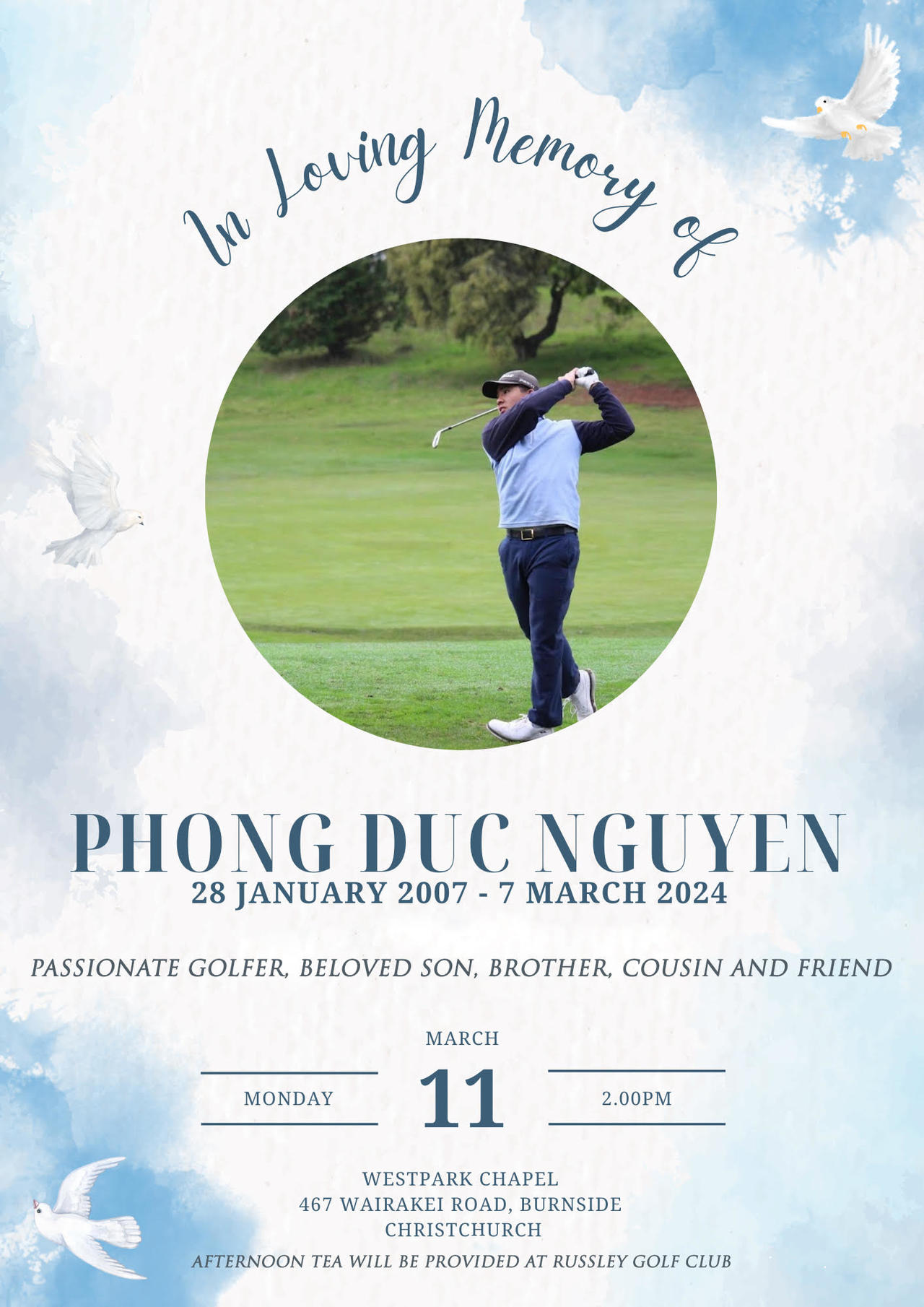 Please join the family in showing respect and farewelling Phong tomorrow, Monday 11th March at 2pm at Westpark Chapel.