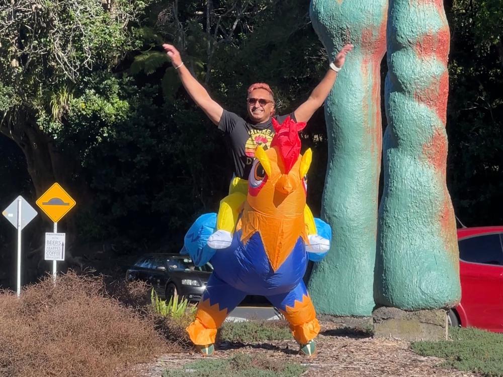 It’s happening: He'll run 21 km in full Titirangi Chicken glory. Real feathers. Real sweat. Real effort. All for the birds.