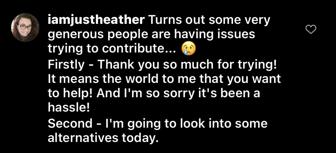 So I'm looking into alternatives that will be more universal and hopefully not hinder the incredible generosity that has been trying to flow in.