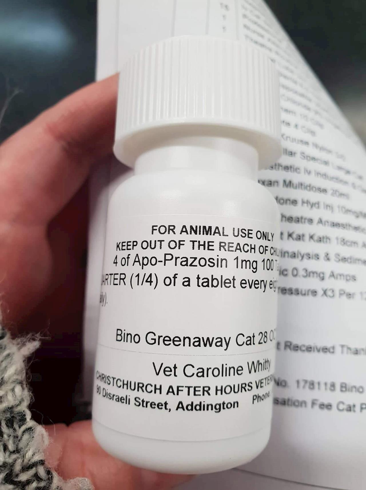 He is one 2 lots of meds 1 pill 3 times a day for anti spams and the other every 12 hours for pain relief. Its super cute he is now known as bino greenaway! They used my last name too cute.