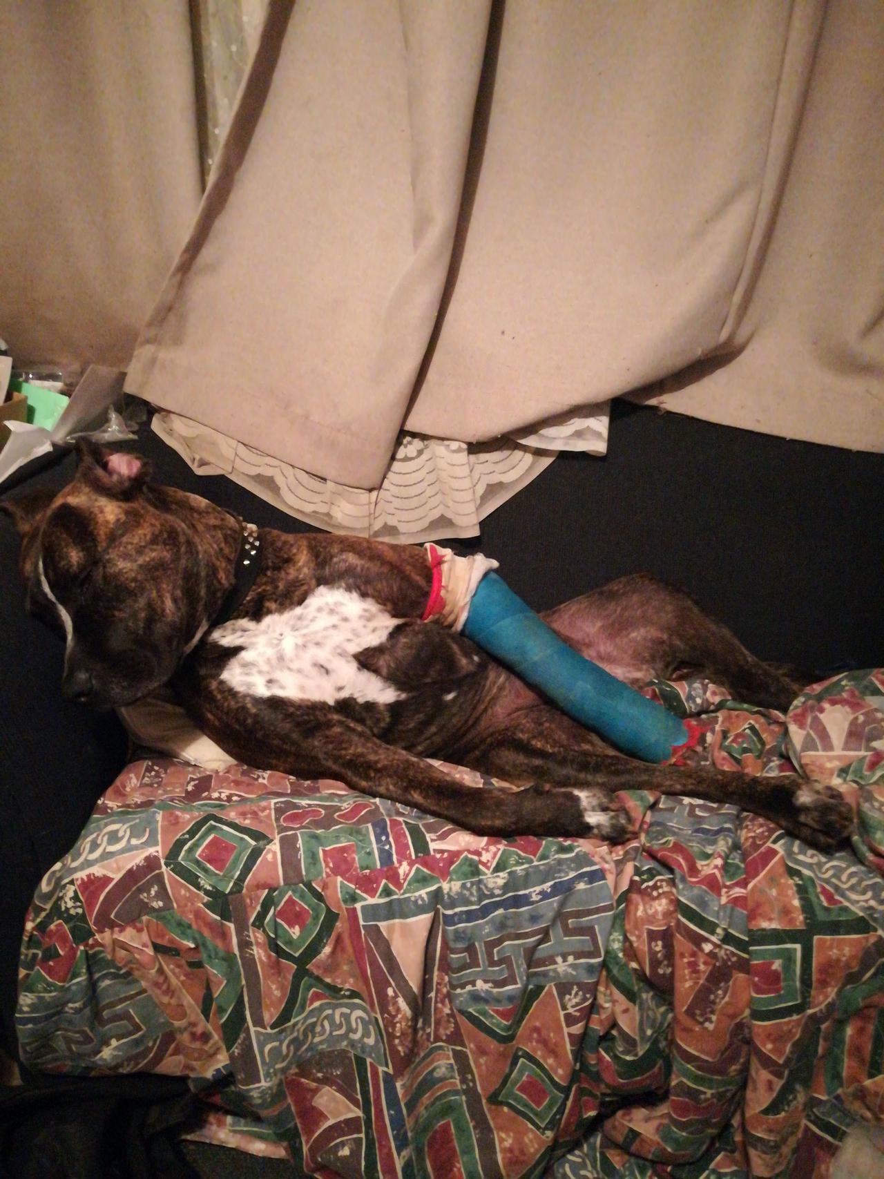 two more weeks and they take off the cast, do another xray.. .. hes been bit down in the dumps and whining.. so beed doing wee treat hunts round the house for him .. letting him sniff things out.. and wee ice blocks for him