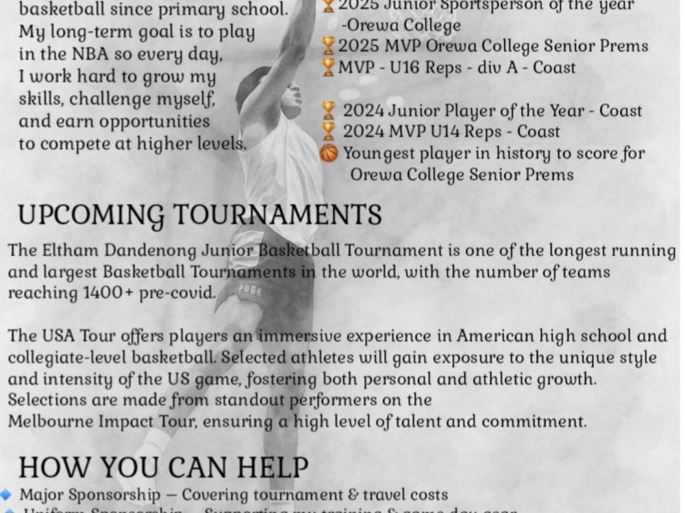 Funds will go toward Levi’s travel, accommodation, tournament fees, uniforms, and training costs for the Eltham Dandenong Tournament and the USA Basketball Tour. Any extra will support his ongoing development and basketball expenses.
