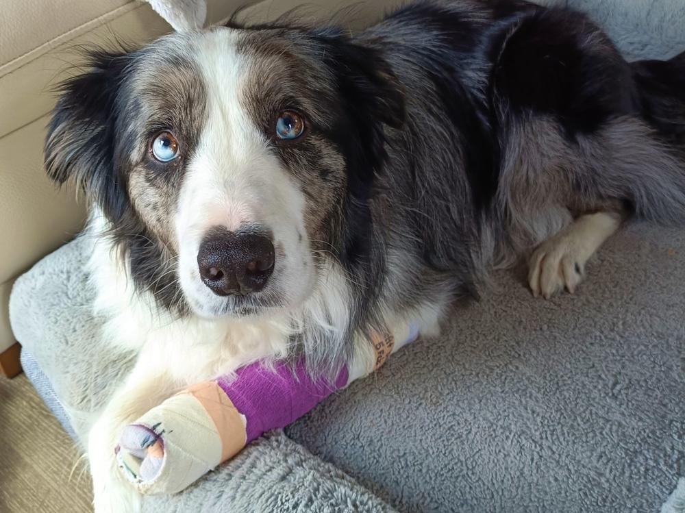 Blue update for all those Blue fans, he is healing well. Splint is off, stitches on shoulder out. Still no walking for another six weeks. But I'm to massage his foot and take off the bandaid in a couple of days. Bought him a new ball for chewing today yeah! thankyou everyone!! He is healing well ❤️🩹
