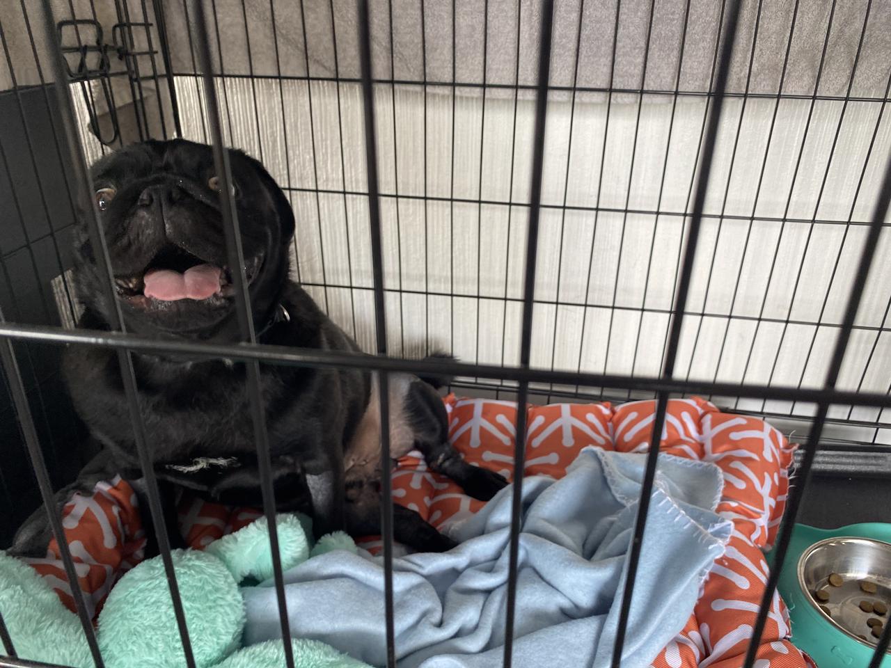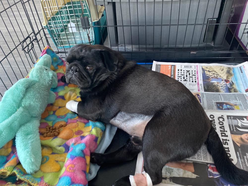 Pickle is at home now and is recovering well. Had a little hiccup with pain problems first day home and had to go back for a injectable pain killer. He has a checkup next week to get his stitches removed. Then five more weeks of crate rest. Again, Thank you to everyone for your support!😊