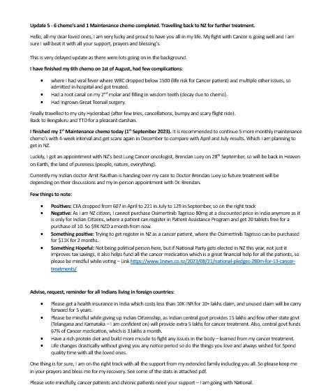 Update 5 - 6 chemo’s and 1 Maintenance chemo completed. Travelling back to NZ for further treatment. 2 September 2023