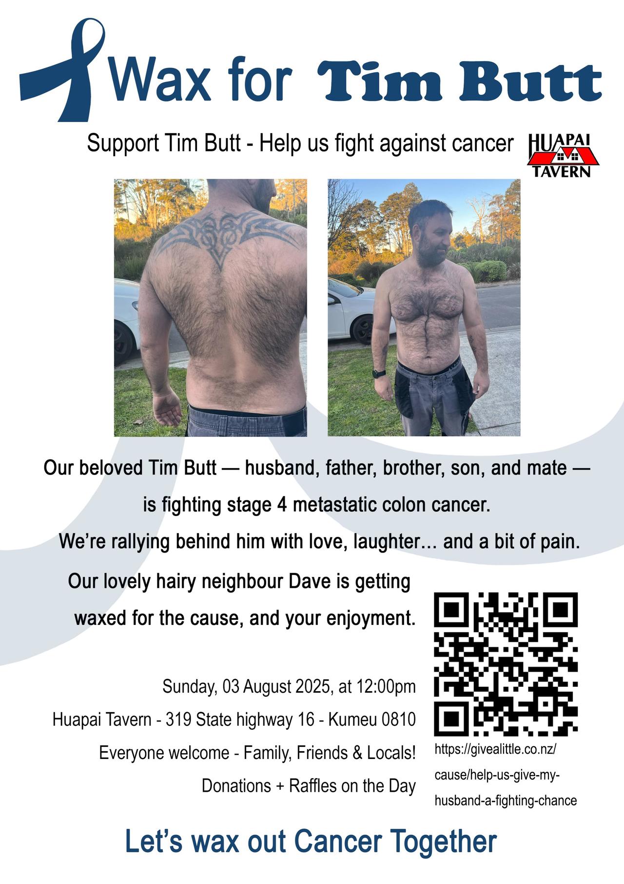 Recently we held our “Wax for Tim” charity event at Huapai Tavern – and wow, what a day! There was laughter, a few winces, and a lot of chest hair sacrificed for a good cause. We were blown away by the turnout.