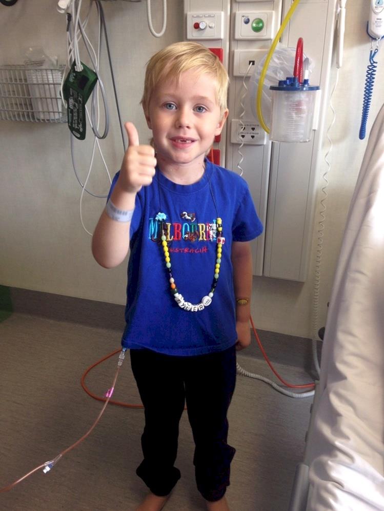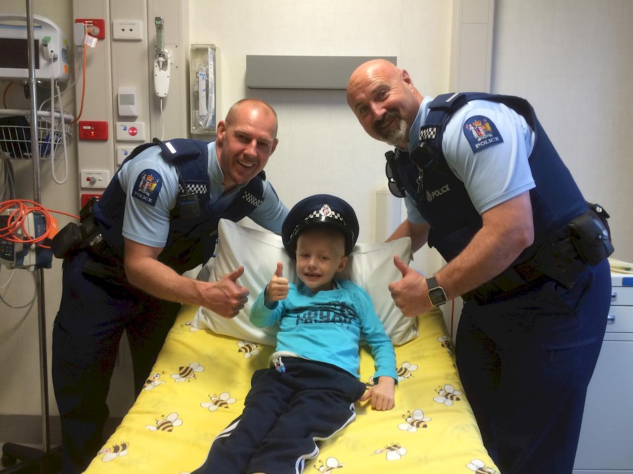 25 May 2016Tyler has finished up his fourth round of chemo and is doing extremely well, so far he has completed four rounds of radiation and is in high spirits. Tyler had two police officers come in to visit and by 10am he had them eating broccoli and cheese sauce.