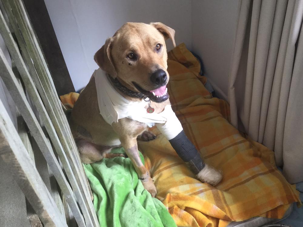 Alas, He has dislocated 2 bones in the elbow of his front leg as well as tearing and stretching all the tendons and ligaments around the elbow joint that hold the bones in place. He has had his bones placed back where they should be and his tendons and ligaments sewn back together and tightened. He is in the high risk period of the bones popping out of place again, hence the frequent vet visits for checks.