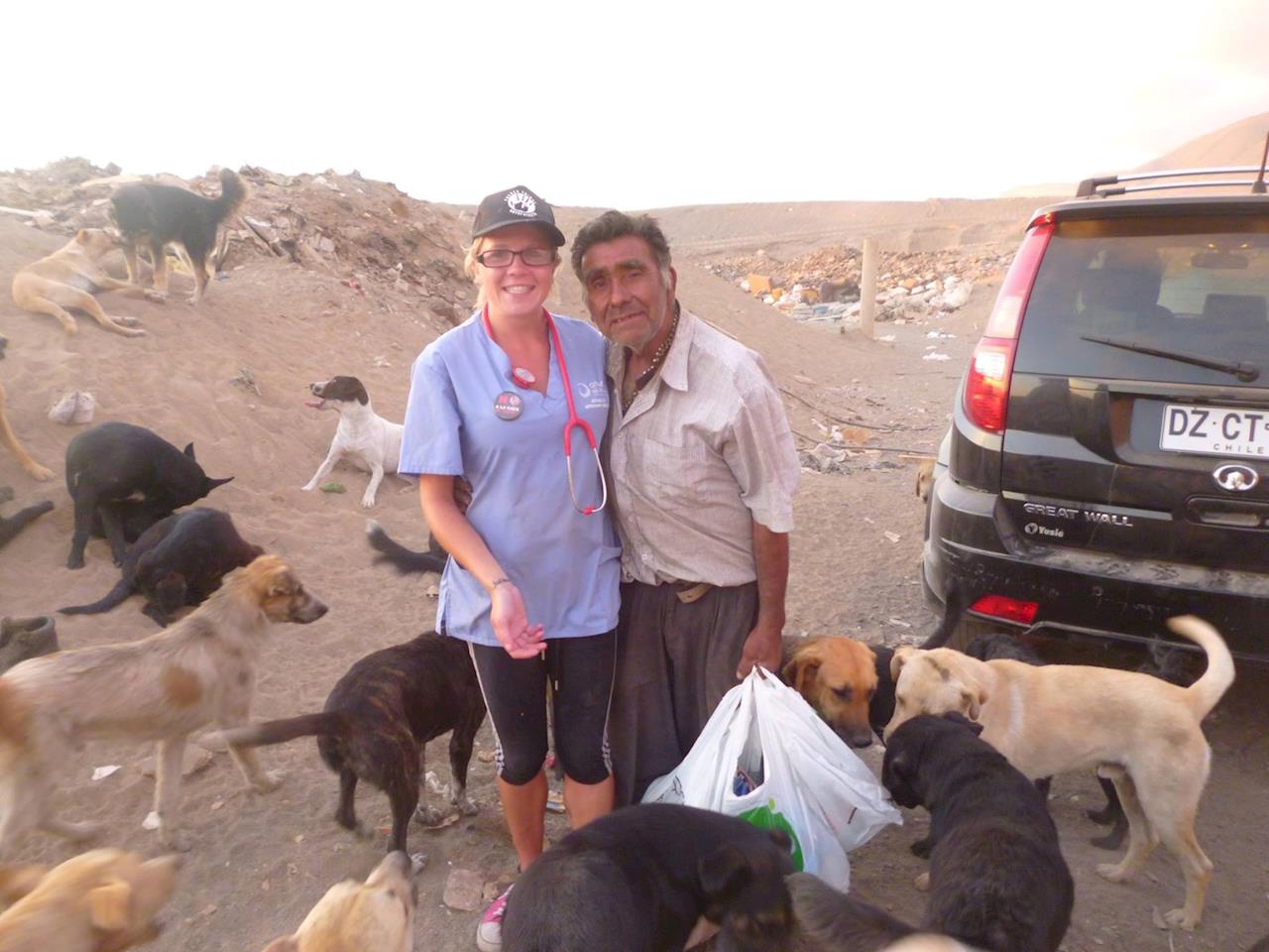 I have visited the landfills in each city. The landfills are a place where people who are sick of their animals or no longer want them come to abandon them. It is just terrible. In Antofagasta there were over 400 dogs in just that one spot of the landfill I went to. Many had mange and infected wounds. I fed all the dogs and treated for mange and parasites and cleaned the wounds. At this particular landfill was a little old man who had no money and lives in a tiny shack, his name is Don Fernando, he had such an impact on me. He never went to school so cannot read or write and must be about 70 years old. Even though he has nothing he looks after the abandoned dogs and gives them love (he cannot afford food so a local group bring dog food every Sunday to him). Amongst the hundreds of dogs I spotted 2 little poodles, they were filthy and their eyes had no hope. Don Fernando told me that one week earlier a woman threw these 2 dogs out of her car window and drove off. The landfill is bad enough for the large dogs there but for 2 young tiny poodles there is no way they would survive, one already had a bad bite wound on his leg so the next day I decided I would go back to the landfill to get these 2 poodles. That night I thought a lot about the Don Fernando so when I woke I went by bicycle to the super market and got as much healthy and tinned food as I could carry to give to him and I wrote him a note to tell him that his kindness had inspired me. When I got to the landfill to get the poodles and I gave him the food he cried, it was very emotional. https://www.facebook.com/photo.php?fbid=10153235726629884&set=pcb.10153235736144884&type=1&theater