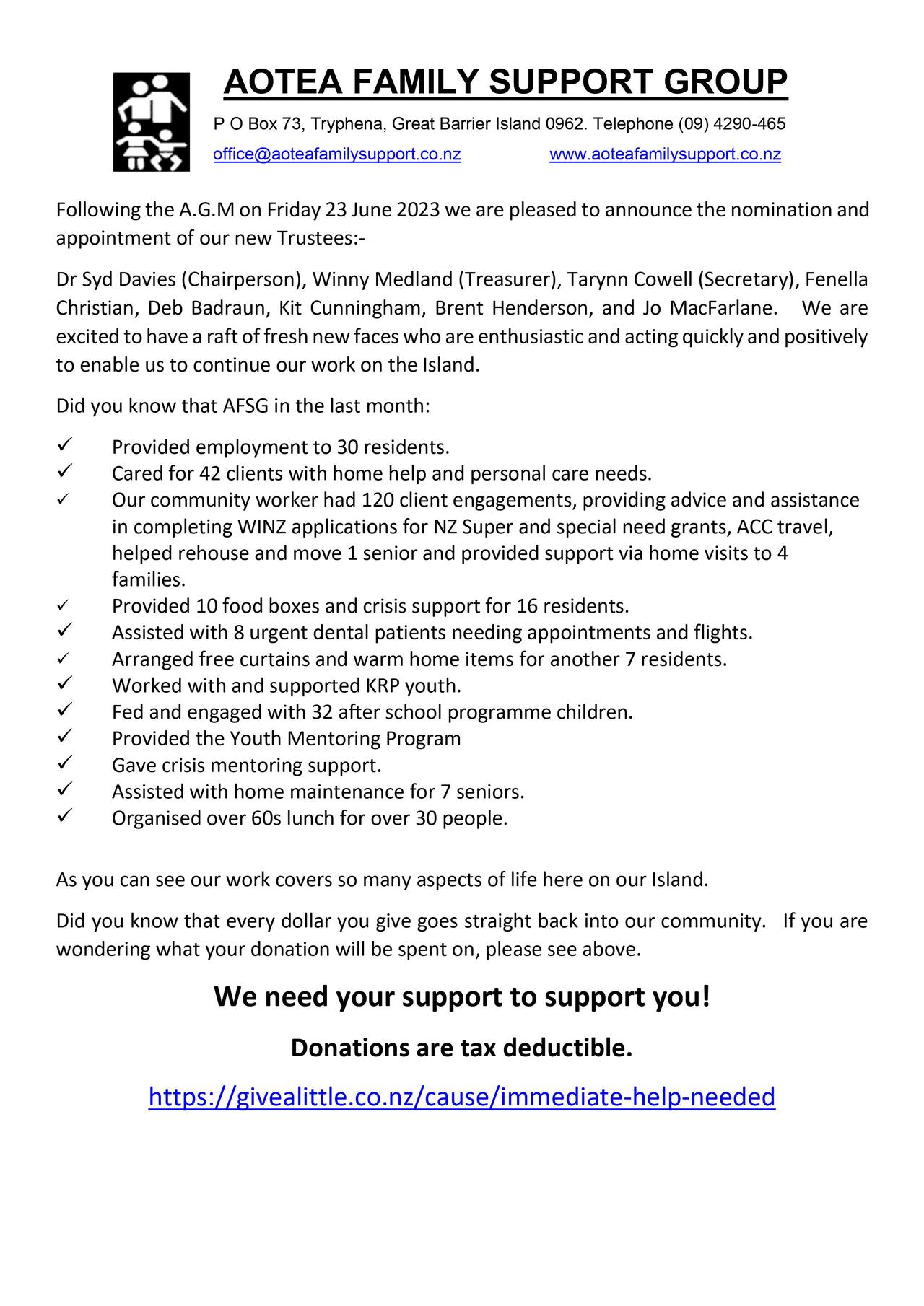 The Trust acts as an umbrella for smaller community group funding, runs the New Year Picnic, First Aid Courses and the Community Group Hui. The loss of these many necessary services would be immense and devastating for our community. AFSG is the only social service on Great Barrier Island.