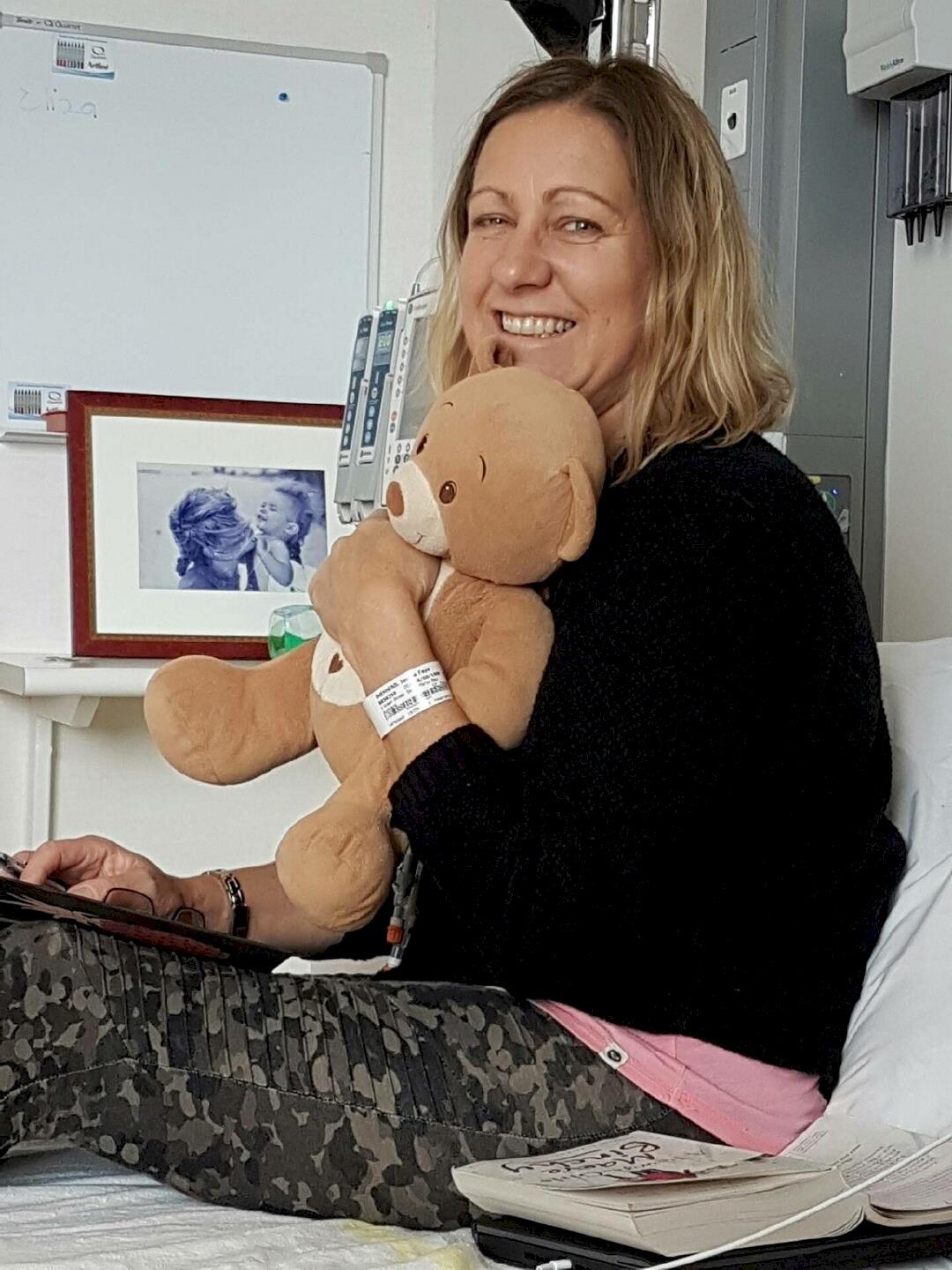 18 September 2016Janine ,day 1 , Motatapu ward , Auckland Hospital with Ruby (Anabelle's bear , which she wanted mum to have while she is in hospital) ;-)