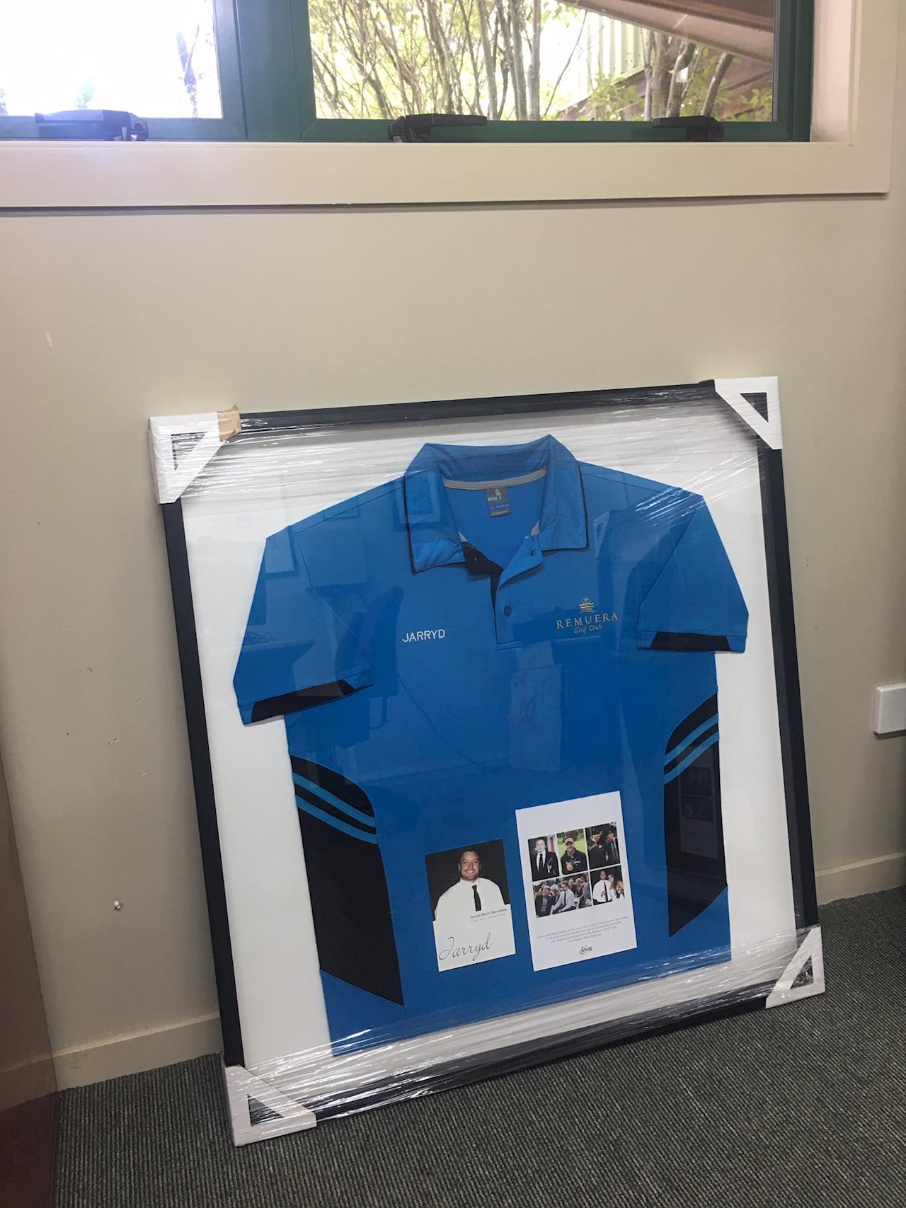 22 August 2019Just an update, the bench is awaiting permission to be put out on the course and Jarryd's work shirt was framed and looks great. Very happy with the end product and will look great in our lunch room, always on our minds Jarryd.