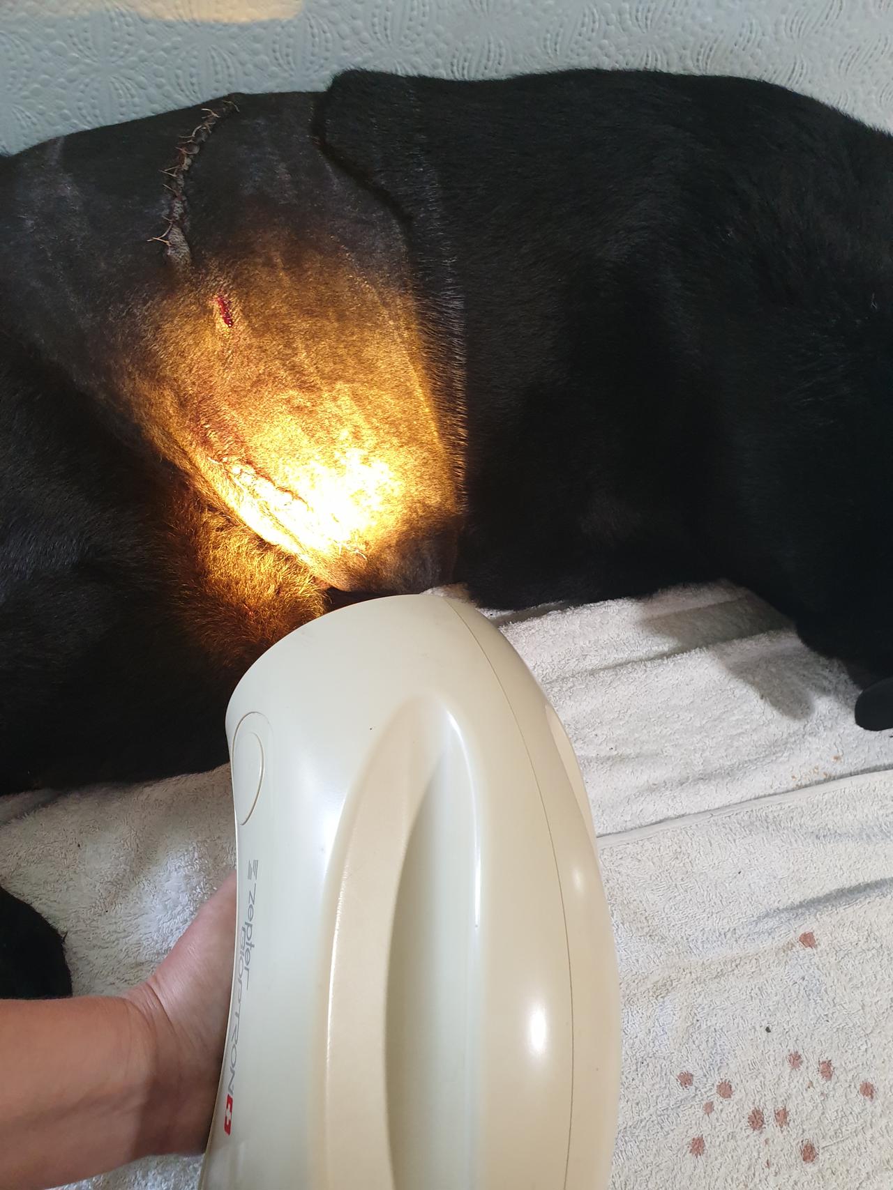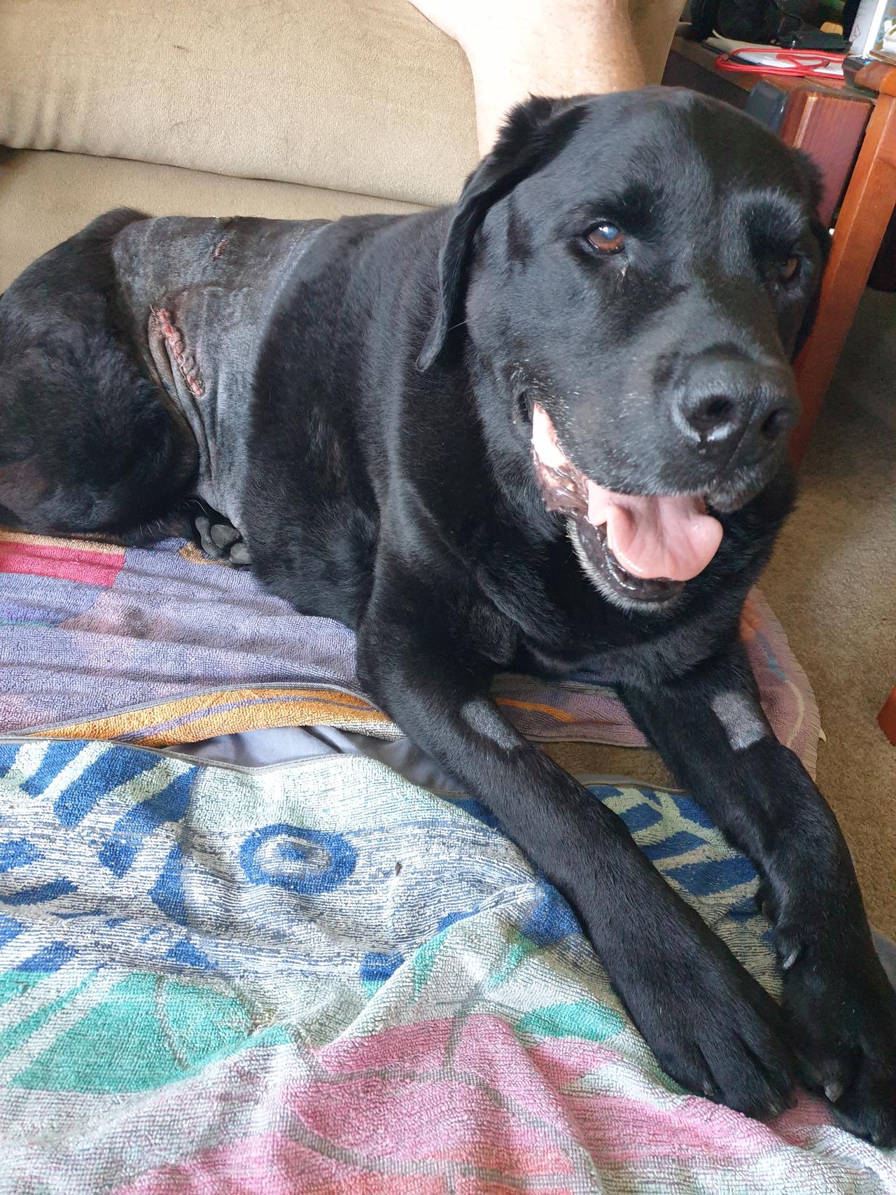 Update: After my last post, the nightmare started. When Jordie fell asleep after bringing him home from the vet, we thought that is great, he will sleep and heal overnight. Well, we were wrong! He only slept about 10-15 minutes before he wake up and started fidgeting, he wanted to go for a wee we let him out to the garden for a wee, so we let him out to the garden. Of course we were keeping an eye on him . When he came back inside, we have noticed his bleeding from his passage area.. It started as a small amount, that we expected. However, later on he started to bleed extensively. Had to change covers on his bed, then we ended up using towels only for quick and easy solution. He’s cot mattress got totally ruined by the seeping through blood, we gonna need to get a new one. There was only one way to keep his bleeding under control, by keeping him laying down on his opposite side. It needed both of us to stay down on the floor with him and try to comfit him. The thunder and lightning doesn’t help, he is naturally scared of thunder, and having pain, and just getting out of dopiness and thunder is not a good mixture. We lost power because of the storm, but luckily some usb lights and candles are always an option. Just after midnight he started to pass really stinky winds and was pushing to get up, so we let him out for toilet again. By the time he came back, his whole side had blood rolling down, and it was really frightening. Les got on the phone, called the after hour vet, but no answer so he left a message. That was before 1am in the morning but we haven’t heard back from them til 7.30am. So we stayed up all night wrestling with our boy, keeping him in place and praying that his wound will seal up and his pain gets lighter. He had some period when he was breathing really fast and his tongue was hanging out on the side of his mouth. He had high fever, so I have patting him with a cold damp cloth that made a bit of difference. I am sure he felt the love we both projected towards him, but he also sensed our worry. He was fighting hard, and cuddled up to dad who was sitting on the floor at the end of the mattress, while his paw was on my head. That is how we survived this awful night. Around 5.30am our boy was started to be very strong willed again, standing up, we thought maybe another toilet need, but this time he walked to his food bowl and parked himself down, telling us that he is very hungry. Les gave him some lamb casserole from a can and a small bowl of milk. He also managed to get him wallow his painkiller tablets while I was covering his passage are with a towel, to prevent more blood dripping.