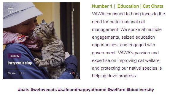VAWA continued to bring focus to the need for better national cat management. We spoke at multiple engagements, seized education opportunities, and engaged with government. VAWA's passion and expertise on improving cat welfare, and protecting our native species is helping drive progress.