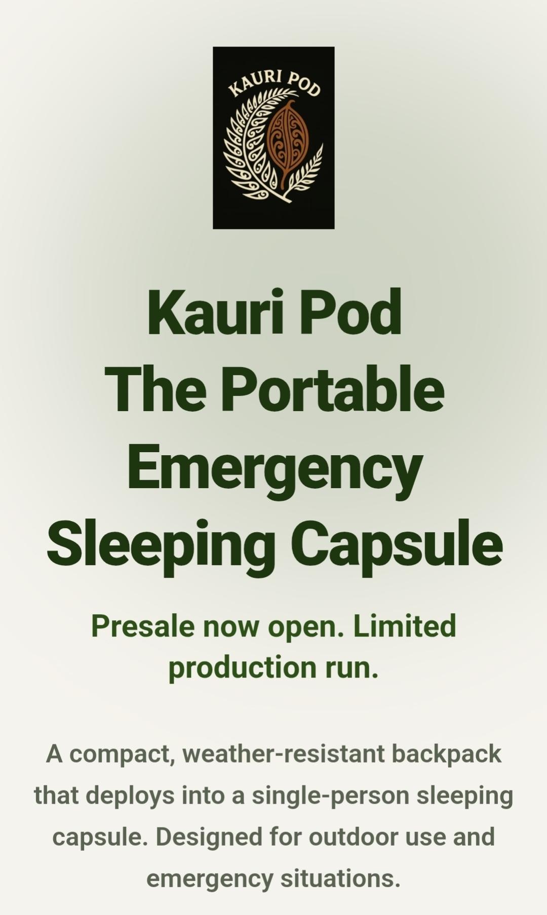 Kauri Pod is a New Zealand–led startup developing a portable emergency sleeping capsule designed for campers, trekkers, and emergency outdoor situations.