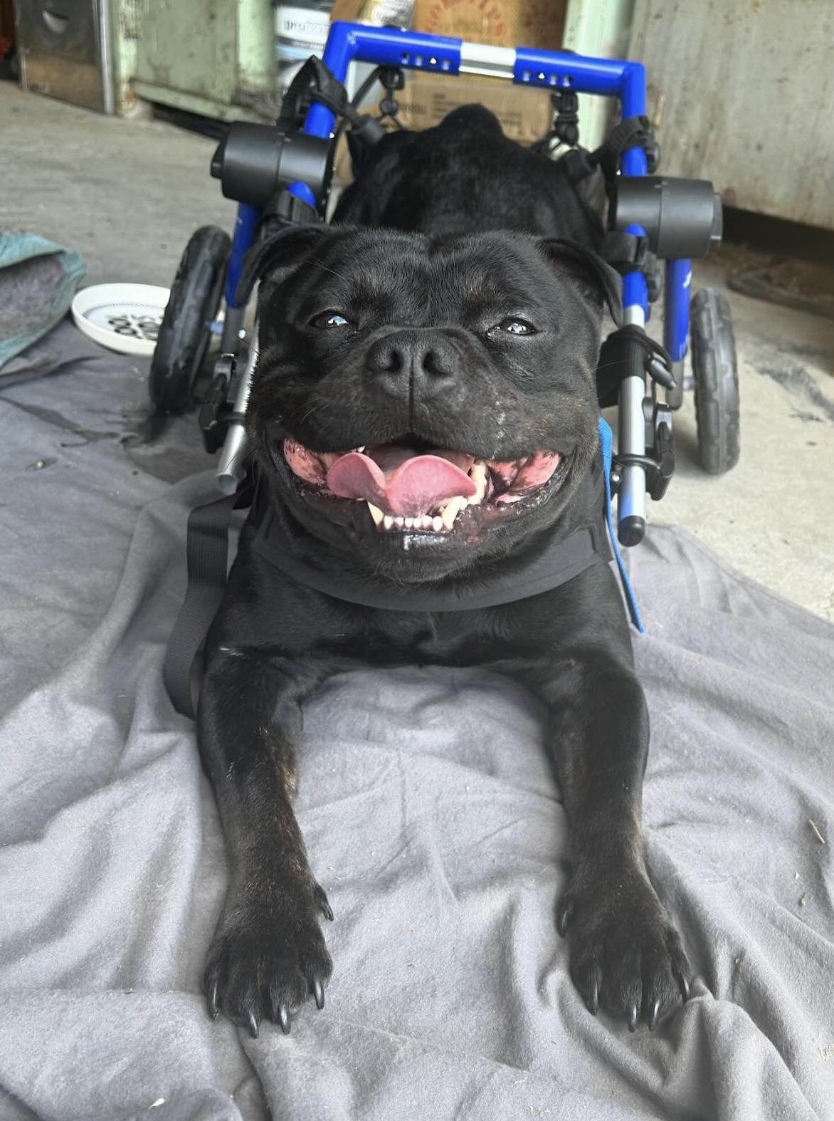 There’s only the smallest glimmer of hope that their boy will walk again one day but until then vet bills already top $35000 and then there’s the cost of a customised wheelchair at $1200+, the ongoing physio sessions, vet visits and doggy diapers etc.