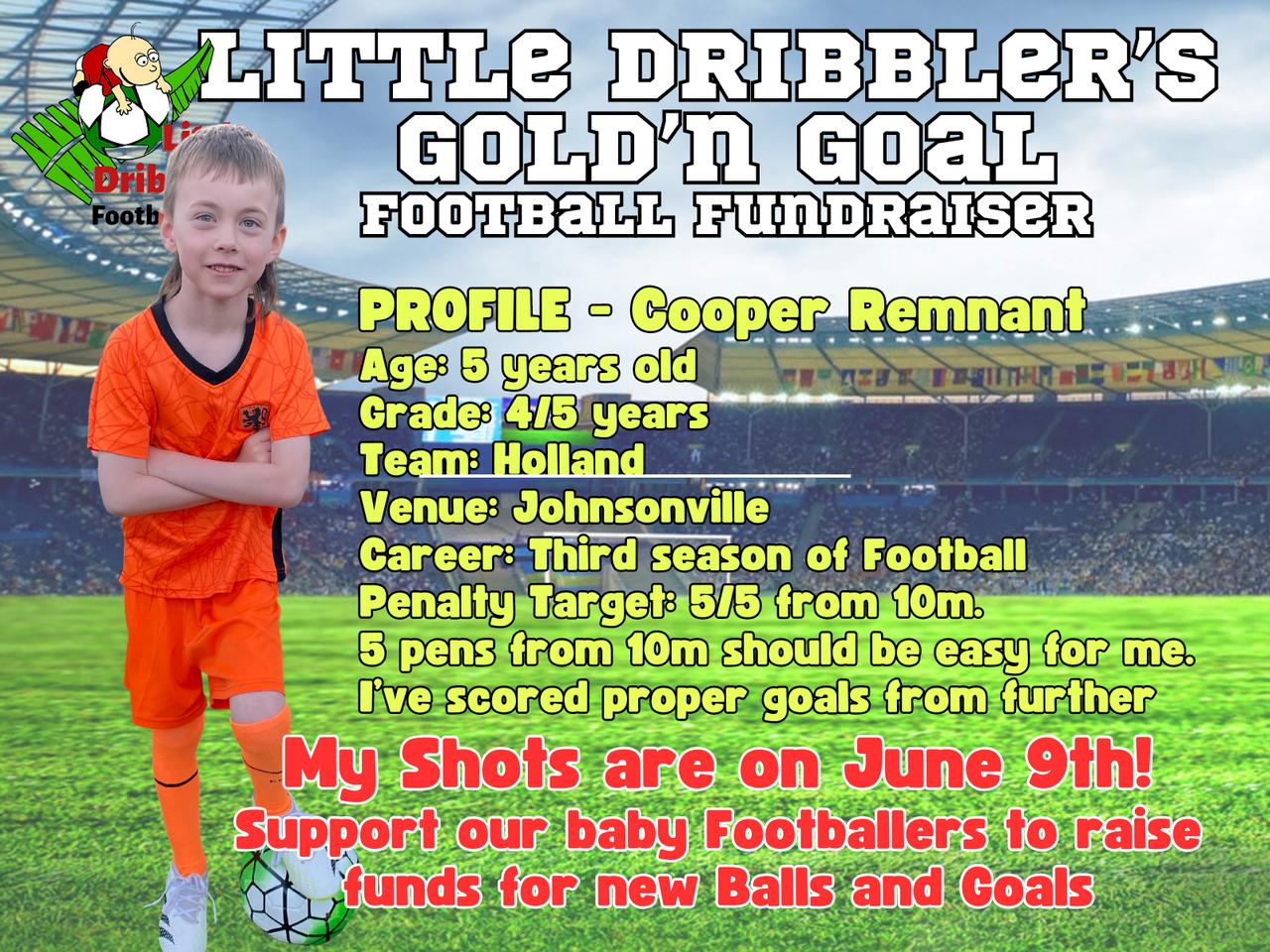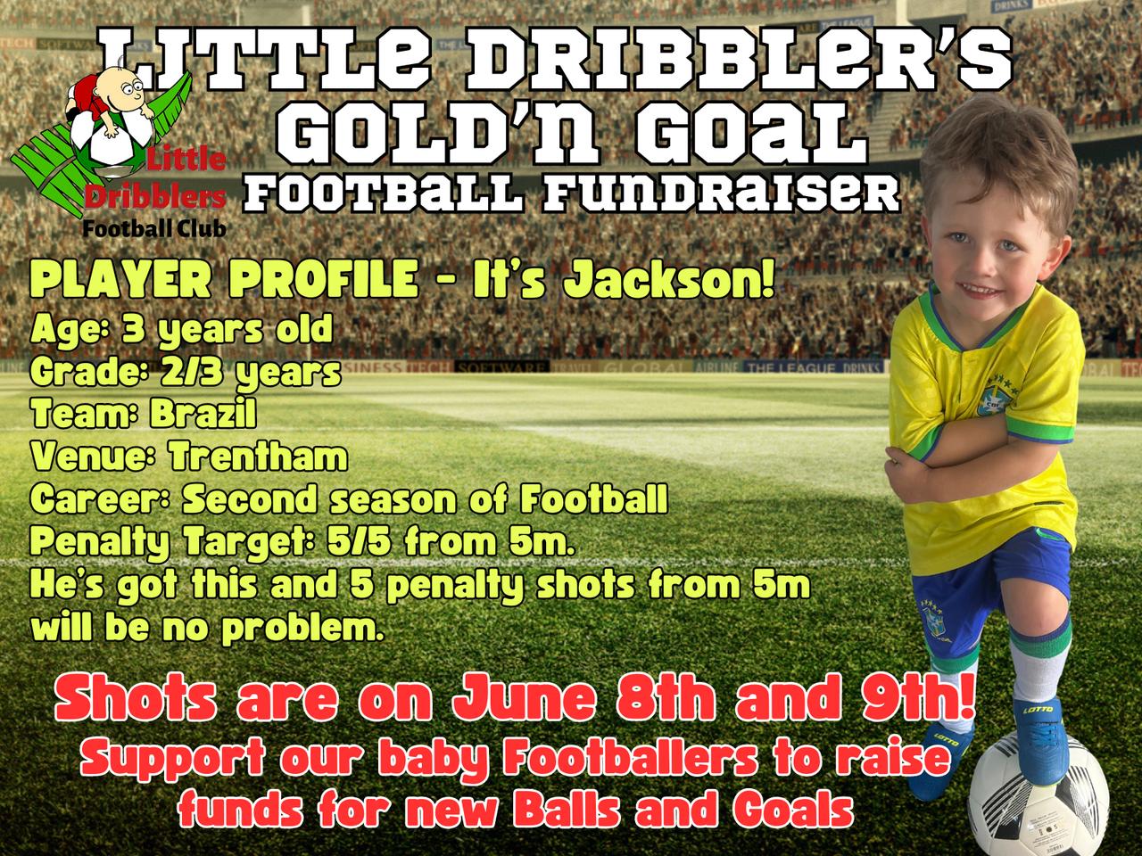 The first Johnsonville Little Dribbler to join the $trike Team is Cooper! He'll be scoring from the 10m mark on Gold'n Goal Day on the 9th of June at Johnsonville School. He's also keen to win the Venue prize and get a bouncy castle for a day so help him out by sponsoring him here..