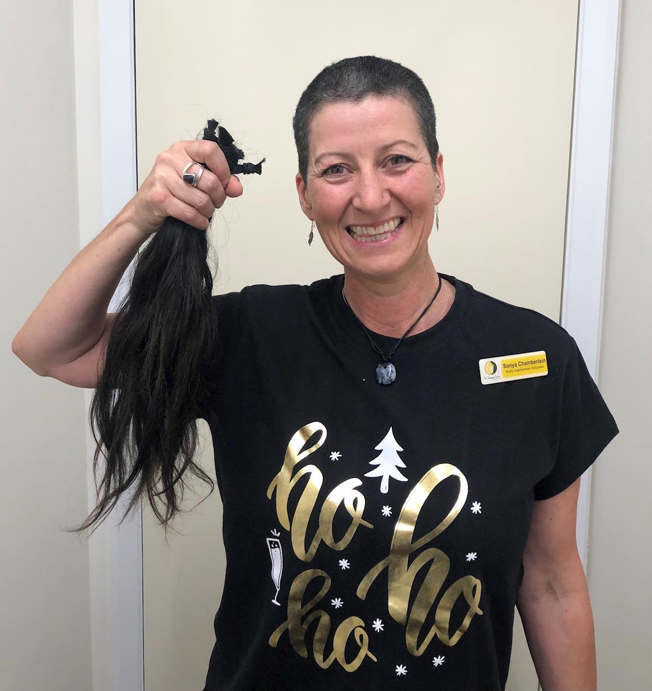 With the appropriate amount of dedication and nerves, Sonya sat in the chair on Monday 14 December and watched her gorgeous head of hair reduced to a close shave.