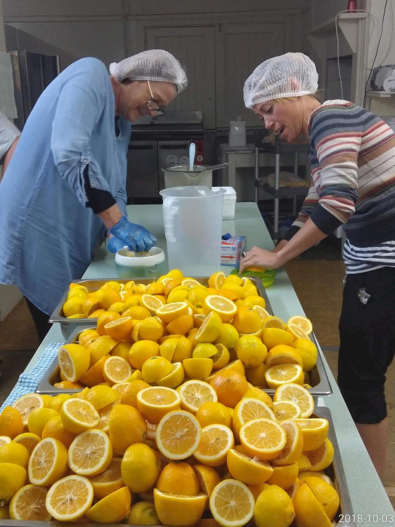 Our League ladies aka "The Aunites" squeezing lemon juice for the social enterprise Manaaki to raise funds purchase more blankets.