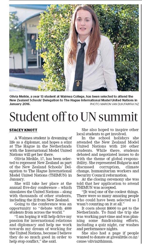 My name is Olivia Meikle and I am a year 13 student at Waimea College in Nelson. I have been given a truly once in a lifetime opportunity to represent New Zealand as part of ‘New Zealand Schools Delegation to The Hague International Model United Nations’ in January 2016.