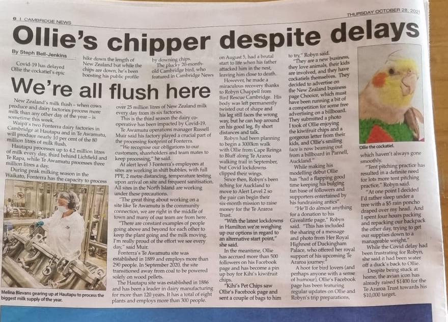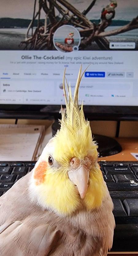 Te Araroa Trust has received the amount raised ($4239.60) and while it's disappointing not to have the donation acknowledged, or a response from them for the huge amount of advertising they received when I appeared on television (twice), several magazines, newspapers, radio, and social media, I just had to shake my tail feathers and move on. The fundraising continues with a new charity - HUHANZ - who are loving what 'Flock Ollie' are doing for all the birdiful animals they rescue. Please follow my new Givealittle page and of course my Facebook page: Ollie The-Cockatiel (my epic Kiwi adventure). THANKIES FOR SHARING THE LOVE 🧡