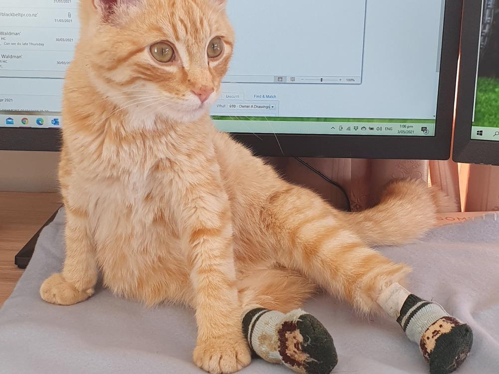 Pascoe has been offered through our vet to be flown to Sydney at 8 Months old if he makes a full recovery to have prosthetic legs put on by a surgeon on Australia whom does Prosthetics for animals, he has successfully done many dogs and has not come across a cat that has required them until now..... Pascoe then will not only be the first cat the surgeon has done prosthetics on he will also be New Zealands first cat to have prosthetics only small to none of animals in New Zealand have received prosthetics so this will be a major break through for a lot of abused animals in New Zealand. This offer had been donated by the surgeon in Australia as a very generous donation which we are extremely grateful for.