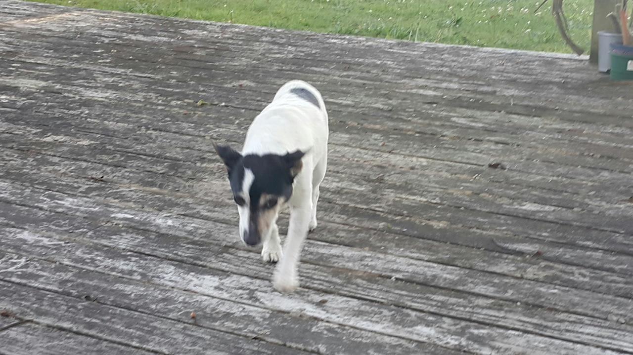 A lovely neighbour at the back of the paddock that we'd been searching for her saw our lost pet poster at the Owhata shops and he was speaking to his friend who said a ‘dog who matched that description turned up yesterday afternoon at his house' They put two and two together and rang us a couple of hours later. She'd been living rough in the field for 9 and a bit days, without water or food AND dealing with her injuries.