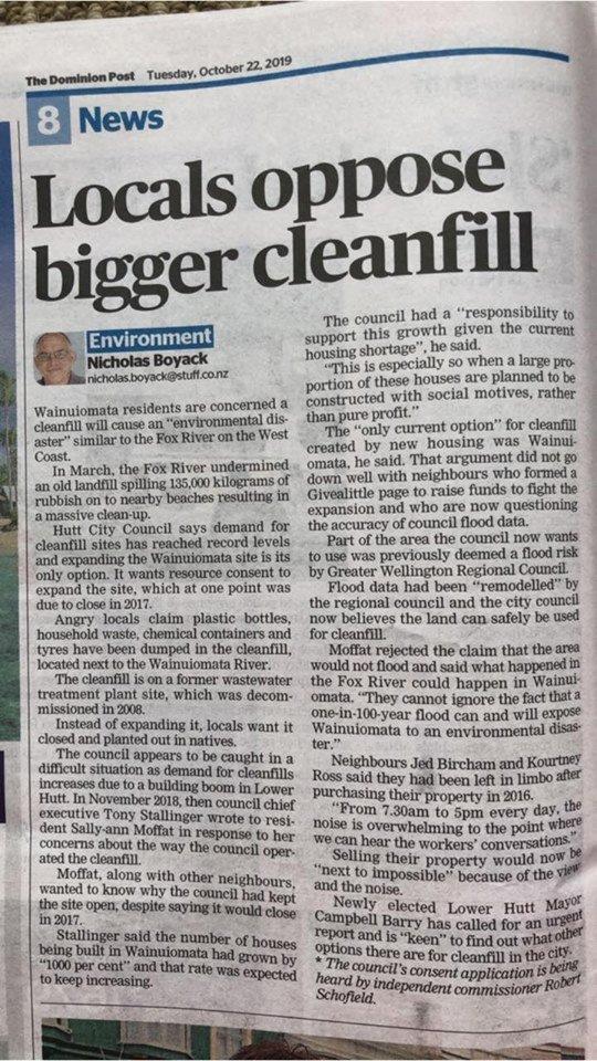 On the Wainuiomata River flood plain and across the road from Remutaka Forest Park (home of repopulating Kiwi) there is a cleanfill. (A cleanfill is a low-cost alternative to landfills for specific and defined waste materials. In this case 'clean' refers to being environmentally clean, meaning that the materials are 'meant to be' free of contaminants that may cause harm to people, animals, or environments that they come into contact with).