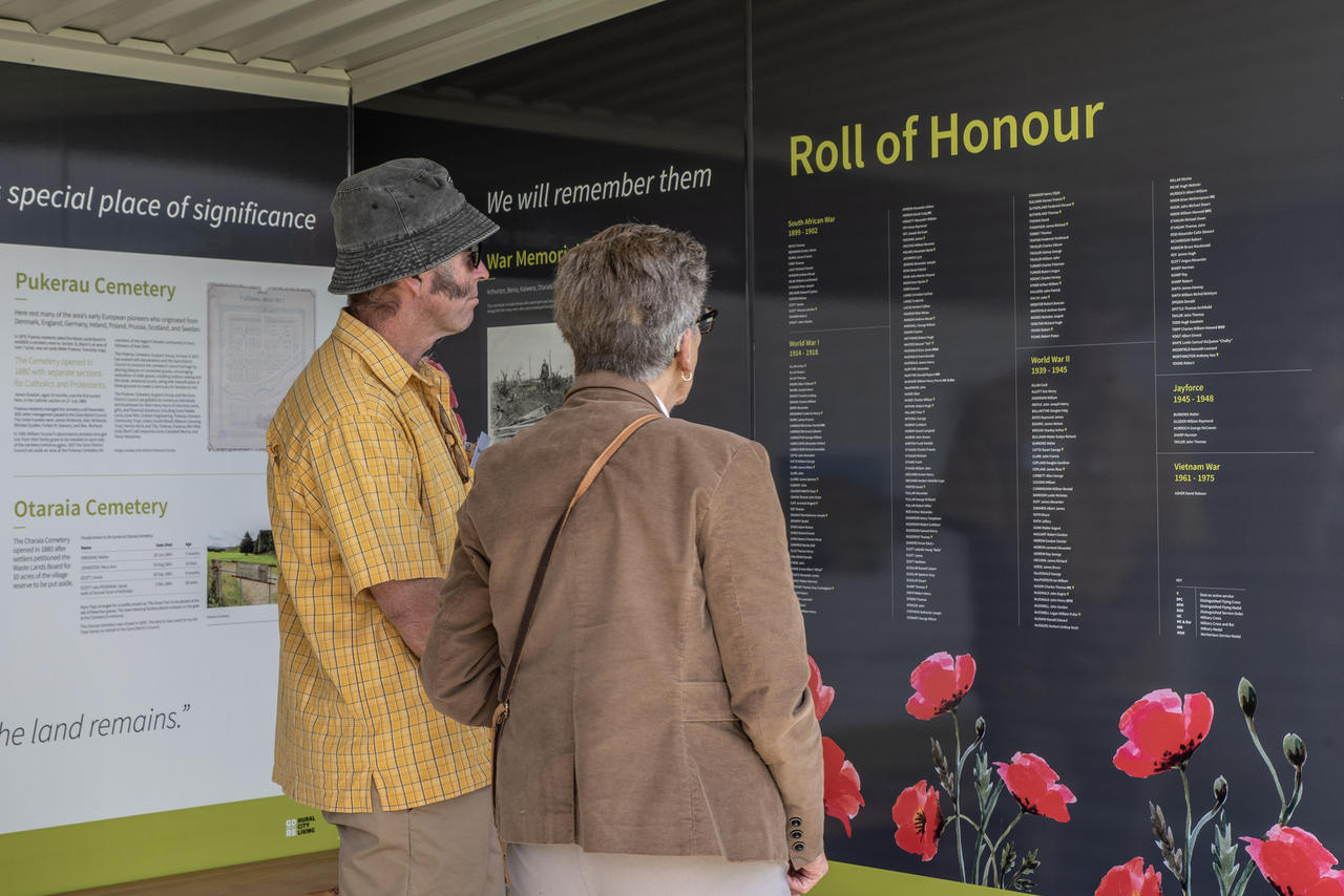 Sanctuary/shelter walls contain district's historical photos & information; list names (incl. maiden names), date of & age at death, and burial/memorial location of 302 buried/remembered at Pukerau Cemetery, plus the 4 at Otaraia Cemetery; and name 219 men & woman born, educated, or employed in the district that served their country.