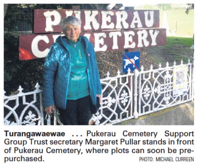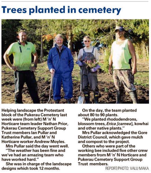 - A very positive meeting was held on Wednesday this week to discuss planned activities with Mayor Tracy Hicks; Ian Soper - who has responsibility for the district cemeteries; Scott McIvor - Sexton; Stewart MacDonnell - Councilor; and members of the Pukerau Cemetery Support Group.