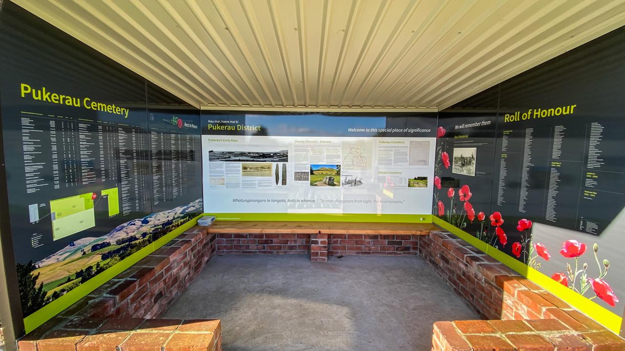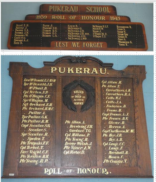 The Pukerau Cemetery Support Group Trust is working with the Gore District Council on information to go inside the shelter. This will include a service memorial board - mentioning those who were born and educated in the district who served overseas along with the many men who were employed locally by businesses including farms, stores, and the railways when they were called for service. Included are those mentioned on the honours board at Pukerau School (see photo); men and women from Arthurton, Benio, Kaiwera, and Otaraia; and those who served in the earlier South African War and later Vietnam War.