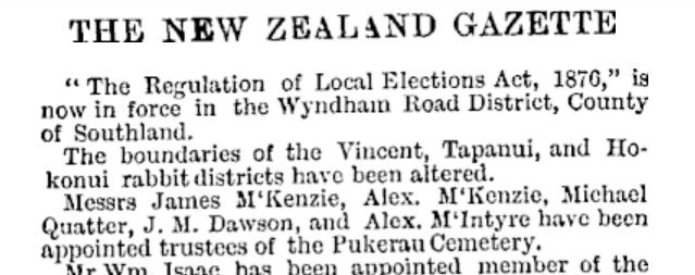 We look forward to sharing our work with you on Sunday 6th November, which includes the district history. The first Trustees of the Pukerau Cemetery, appointed in 1880, were Messrs James McKenzie, Alex. McKenzie, Michael Quatter; J.M. Dawson, and Alex. Mclntyre.