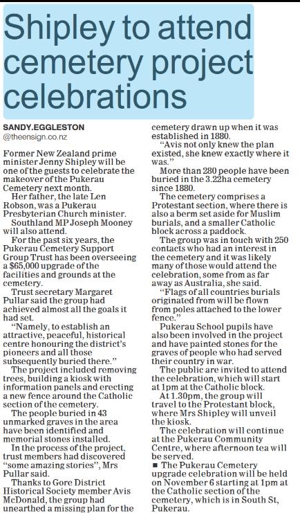 Ensign reports on Pukerau Cemetery projects - announcing that Jenny Shipley, previously a resident of Pukerau, will speak at the celebrations in Pukerau.